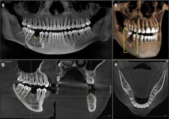 A 3- D dental CBCT assists with accurate placement of dental implants by accurately defining the location of anatomical structures as well as calculating the width, depth and density of the jaw bone. It also shows the pathway of nerve canals in a 3D view within an accuracy of 0.1mm, which assists with implant placements as well as removal of teeth in Oral Surgery.